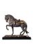 Modeled with anatomical precision, the animal is performing a piaffe, with one leg raised in a majestic stance. Handcrafted in matte black porcelain, the base tone is enhanced by the deeper black of the blankets and golden luster accents.